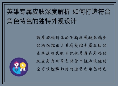 英雄专属皮肤深度解析 如何打造符合角色特色的独特外观设计