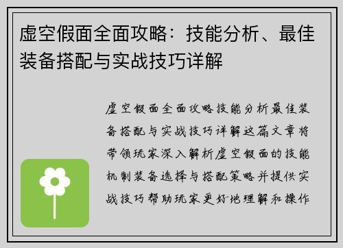 虚空假面全面攻略:技能分析、最佳装备搭配与实战技巧详解