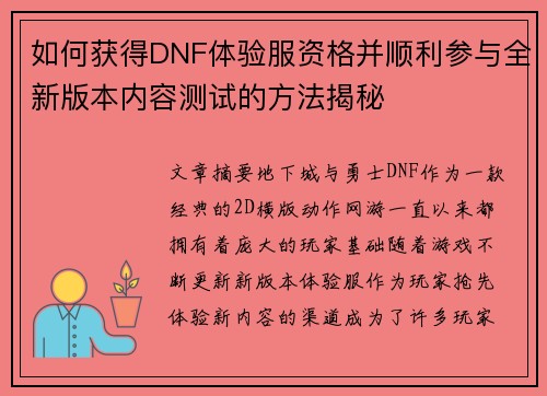 如何获得DNF体验服资格并顺利参与全新版本内容测试的方法揭秘